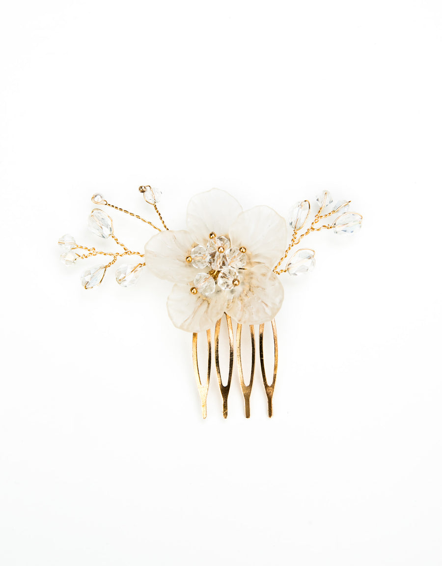 The Bellezza Haircomb consists of a hand-beaded resin flower with a spray of crystal beads, attached to a gold metal comb.