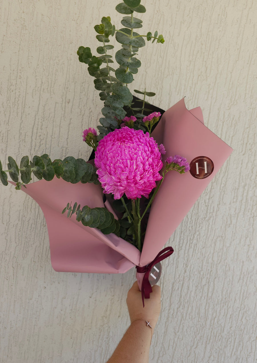 Single Fresh Pink Chrysanthymum Disbud with seasonal foliage wrapped in our signature paper.